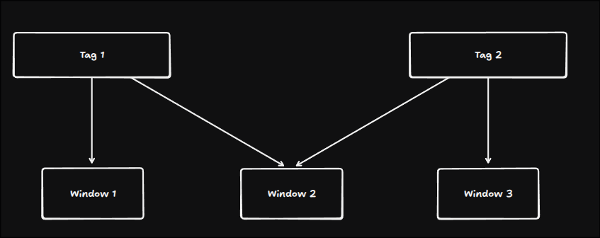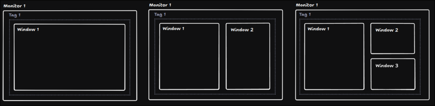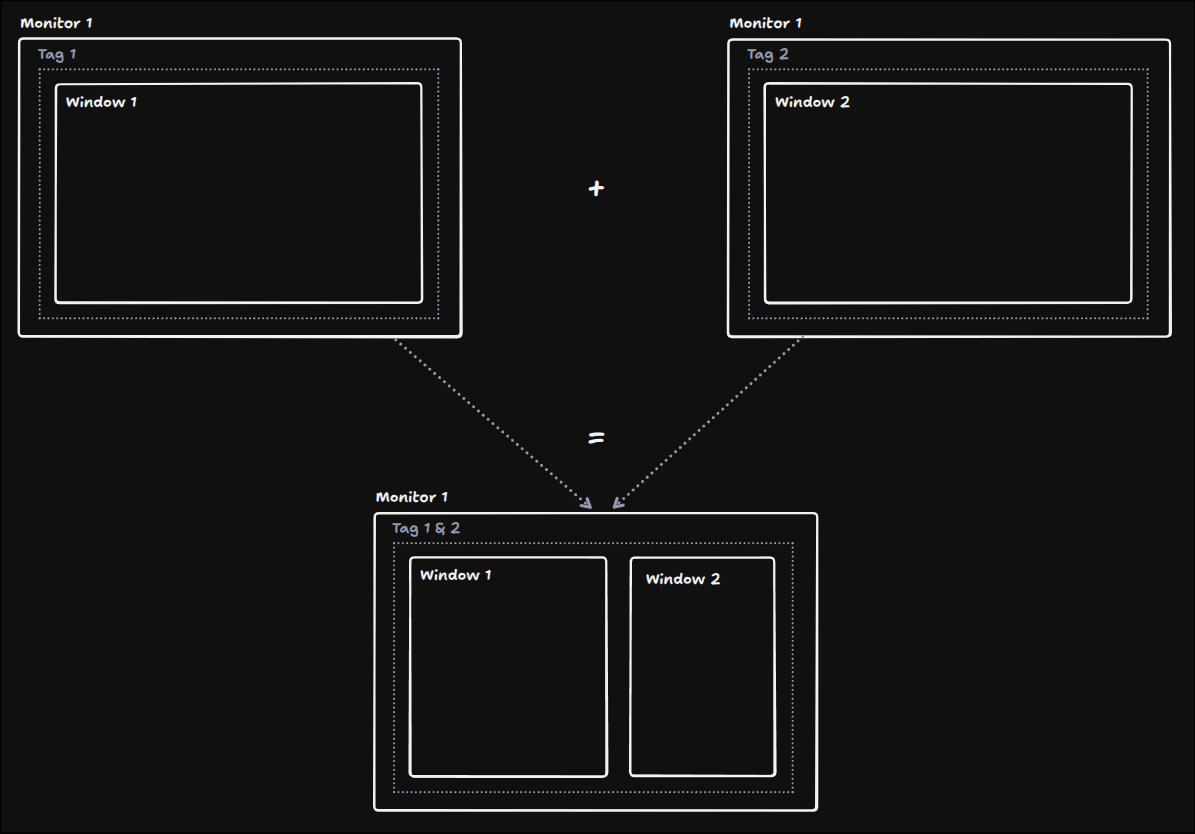 In a tag-based window manager, in a similar way to how multiple application windows can be assigned the same tag (i.e. your browser and Figma being both assigned to tag 1), each window can be given many tags.