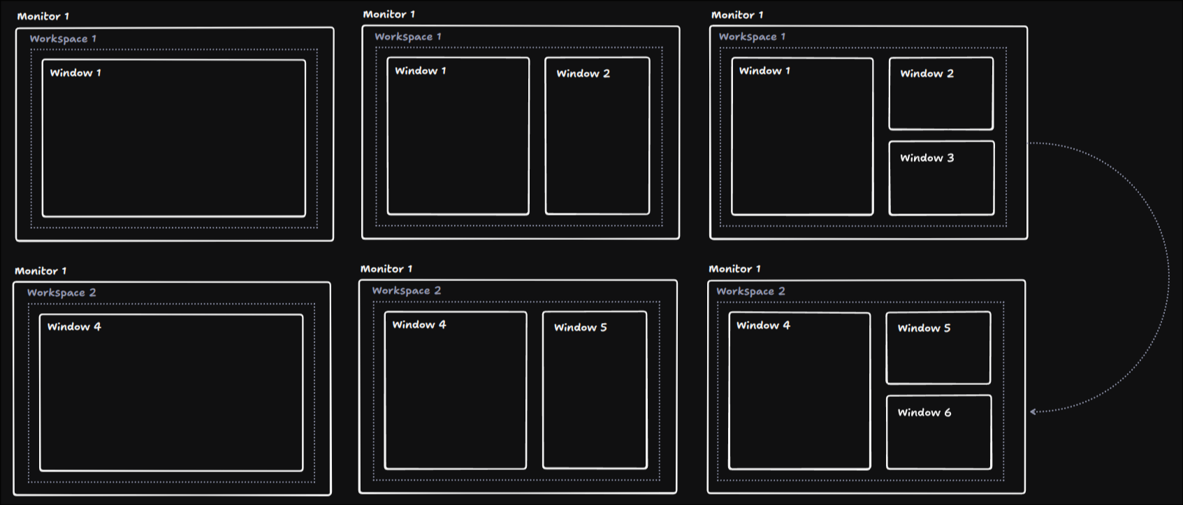 Earlier, we established that workspaces have a strict relationship with monitors: one workspace is displayed at a time on a given monitor, and you can switch between any number of workspaces on that monitor. Again, workspaces are like containers - you can put any number of application windows within them, but only one can be opened at a time.